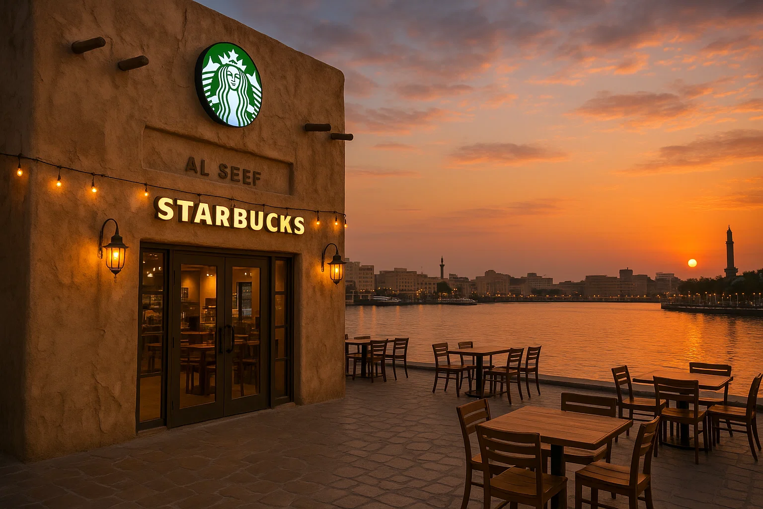 ドバイ・クリーク沿いのMarsa Al Seefには、伝統建築風ファサードが絵になるスタバも。夕景のテラス席が心地よく、旧市街の雰囲気を味わえます。