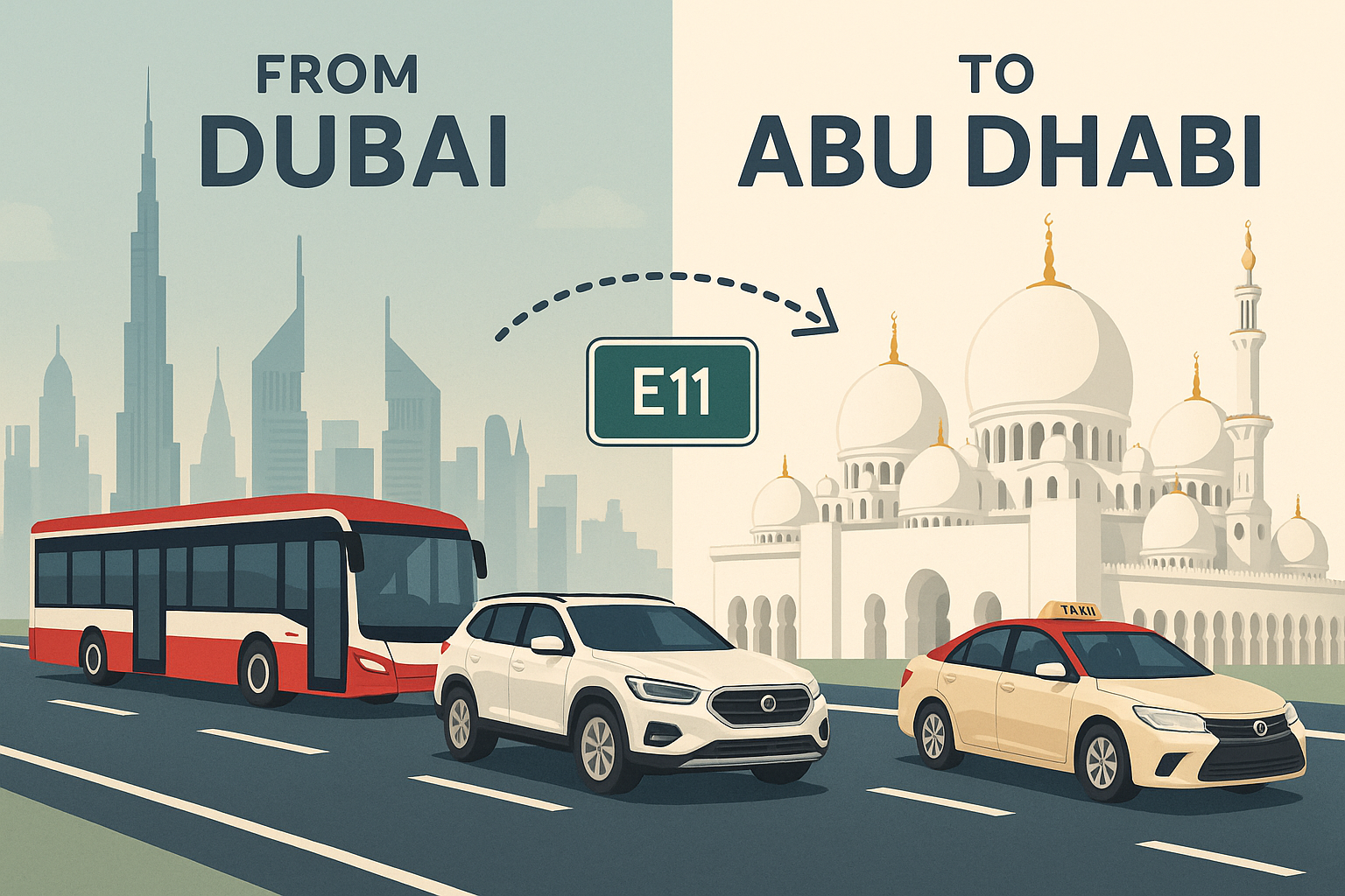 ドバイとアブダビの距離は、出発地と目的地にもよりますが、おおむね約120〜150km。交通渋滞がなければ、車で約1時間半から2時間が所要時間の目安です。両都市を結ぶメインの高速道路は、海沿いを走るE11号線(Sheikh Zayed Road)。アブダビの主要観光地であるシェイク・ザイード・グランドモスク、ヤス島(F1サーキットやワーナーブラザース・ワールド)、ルーヴル・アブダビなどへ向かうには、まずこのE11号線でアブダビ市内を目指すのが基本ルートとなります。